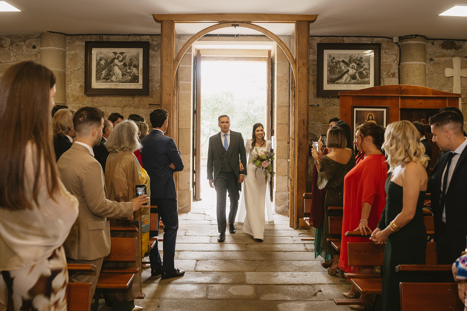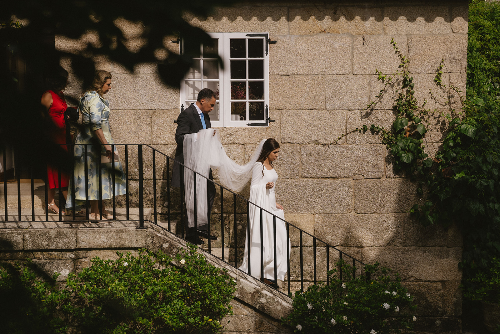 Los dos se prepararon en el pazo rodeados de su familia. Nos encanta este momento en todas las bodas. Es maravilloso ver cómo los nervios y la emoción se apoderan de cada una de las personas que está ahí. Los momentos previos a la bajada a la iglesia son intensos pero muy emotivos y nos encanta acompañar a cada una de nuestras parejas en esos minutos tan especiales.